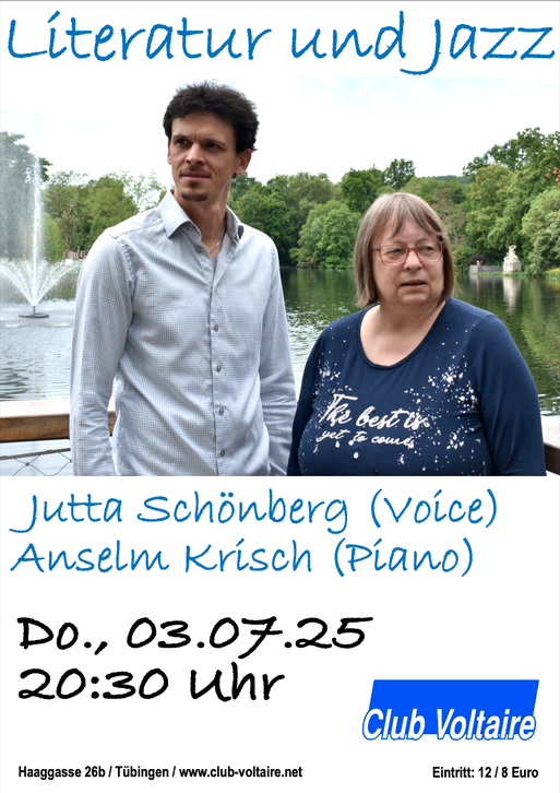 Am 03.07.25 um 20.30 Uhr habe ich einen Auftritt im Club Voltaire in Tübingen. Der Titel lautet: Literatur und Jazz. Ich lese Kurzgeschichten aus meinem Buch "Verguckt". Den musikalischen Teil übernimmt der Tübinger Jazzpianist Anselm Krisch, das wohl größte Jazztalent, das wir hier haben. Darauf freue ich mich schon sehr. Den Ankündigungatext finden Sie hier.